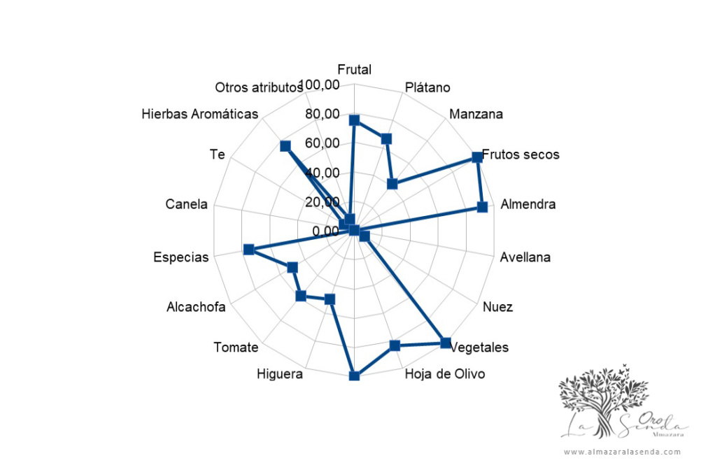 Presenta un sabor muy equilibrado en el que destacan notas verdes de almendra y plátano acompañadas por una mezcla de aromas y sabores que recuerdan a frutas frescas, un ligero sabor y olor a hierbas aromáticas.